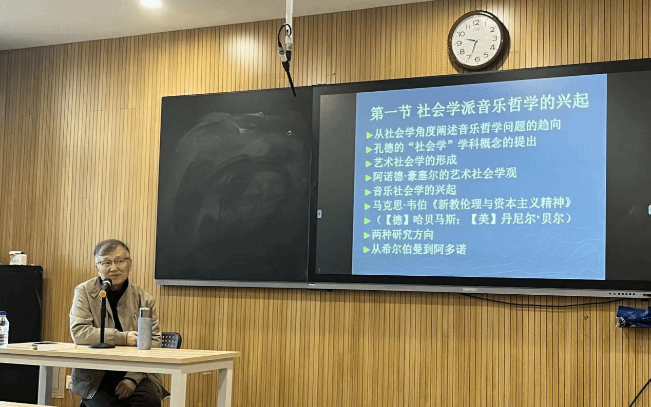 10月21日上午讲座进入第二场,题为《社会学视野中的音乐哲学》。宋瑾教授首先阐明了20世纪20、30年代在西方音乐哲学研究中出现的社会学视角倾向,逐一讲解了社会学派音乐哲学的代表人物,并围绕该学派核心人物阿多诺及其著作《新音乐哲学》展开分析。宋瑾教授从阿多诺的视角细致解答了为何20世纪的现代主义音乐会呈现出技法严谨却难被听觉感知的“不美”特质,并借此总结现代音乐的形式与技法特征。他强调社会学派将音乐视为“意义载体”,其形式选择本质是社会历史的折射,需要结合政治经济语境来理解。