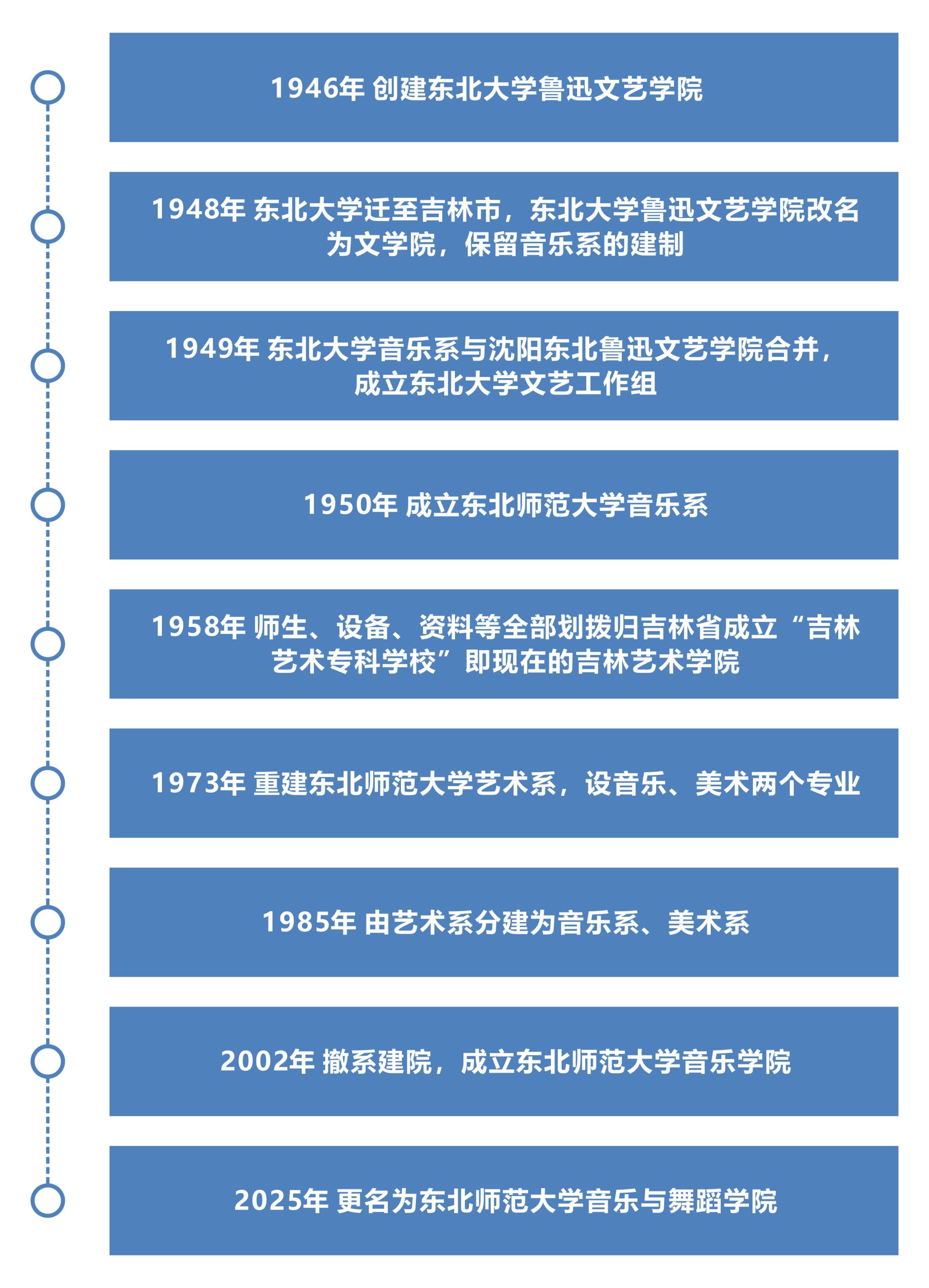 音乐与舞蹈学院前身为东北大学鲁迅文艺学院音乐系,创建于1946年,2002年撤系建立音乐学院,2025年更名为音乐与舞蹈学院。